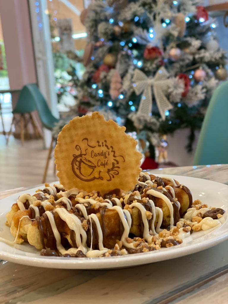 2 bolas de helado (Vainilla y chocolate), nata, sirope de chocolate y toppings de Lacasitos y Oreo